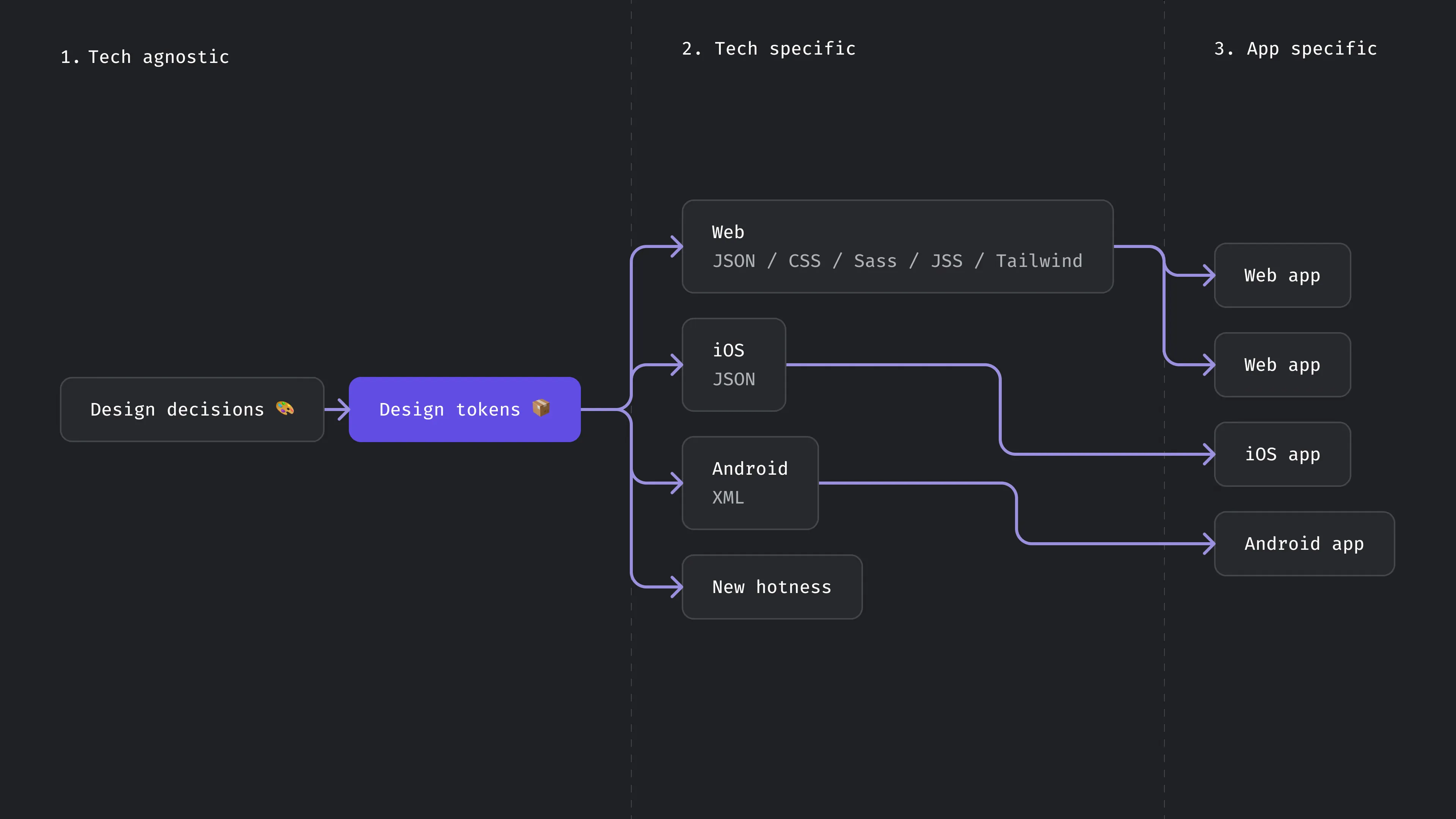 As I said, this is an ideal workflow I imagined. To exist, design tools and development tools should be able to communicate. Currently, the only way I know to generate design tokens is by using Theo, a design token generator made by Salesforce. What Theo does is simple: it takes as input a tech agnostic file format like JSON or YAML and outputs tech specific files for each platforms.