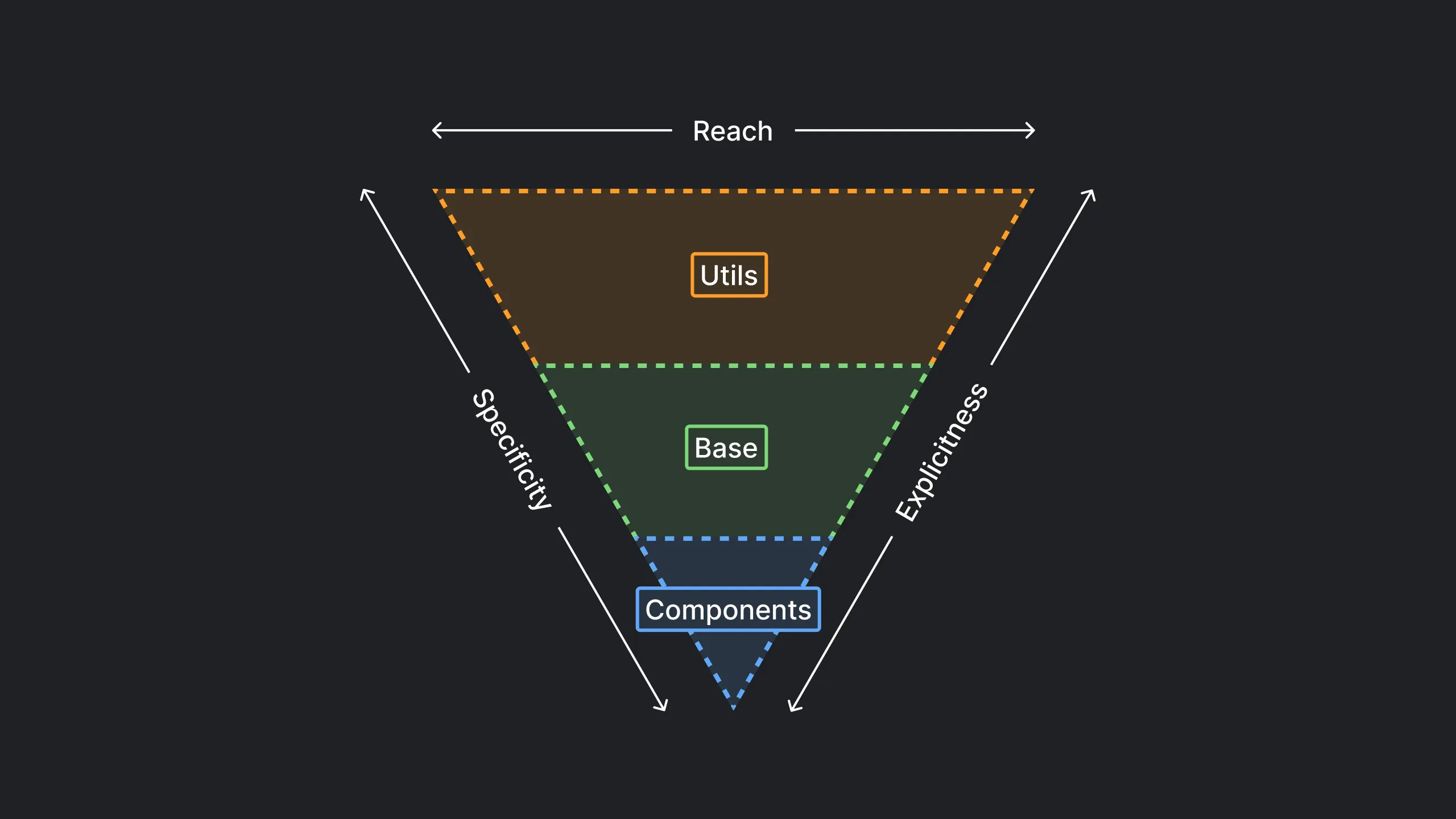 ITCSS stands for “Inverted Triangle CSS”. Created by Harry Roberts, it’s a methodology to organize your CSS codebase into several sections (called layers), which can be represented as sections of an inverted triangle. The original methodology has 7 layers but I’ve adapted it to suit my need.
