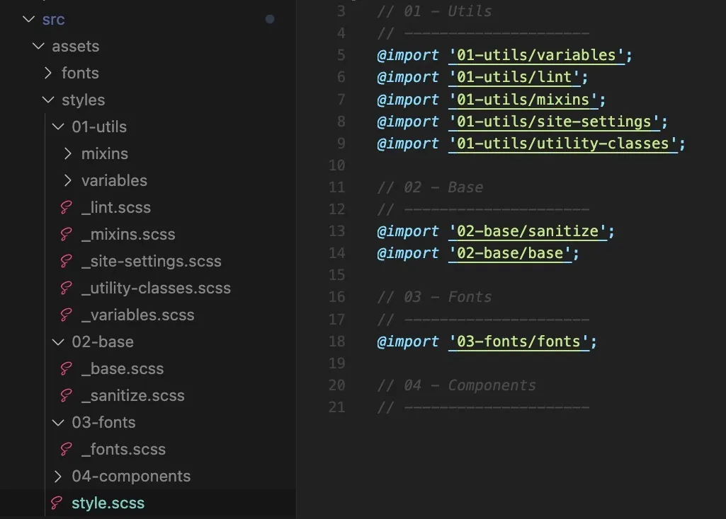 sanitize.scss) - Fonts : my font imports that I could also directly put in the “Utils” layer